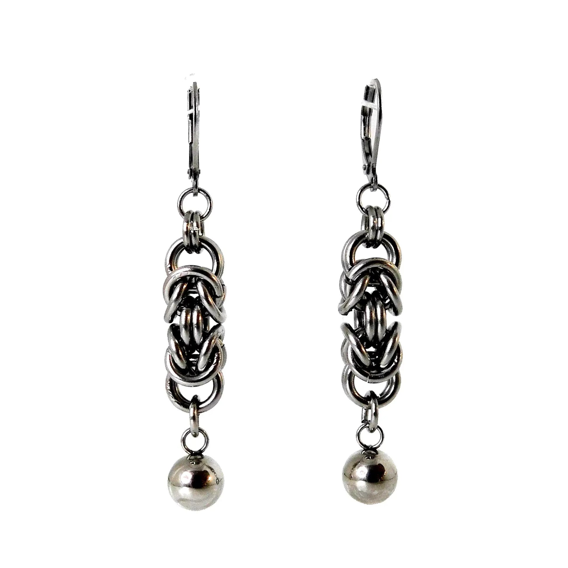 Handwoven chainmail earrings with ball detailing.